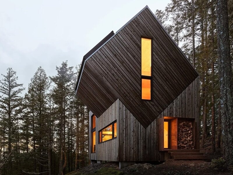 Perched in the forests of Canada’s Keats Island, The Nest by Daria Sheina Studio is an innovative, three-level off-grid retreat that maximizes a compact footprint through vertical stacking. Two interlocking geometric volumes harmonize with the Pacific Northwest surroundings without overwhelming the landscape. Its minimal survey of land reflects a commitment to low-impact, sustainable living—using prefabricated construction to reduce site disturbance and build swiftly.